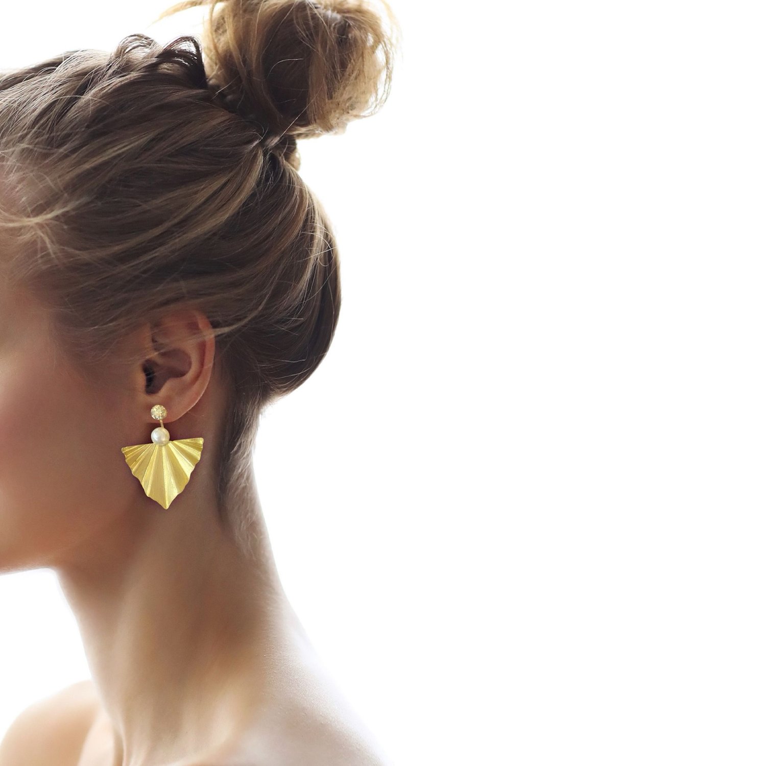 Pendientes creados a partir de unas antiguas fornituras con cierre de ballestilla catalana de los años 50/60´s con baño de 24k y circonita engastada. Lleva añadida una perla plana y un abanico en latón tratado de diseño art decó. 3,5 x 2,8 cm.